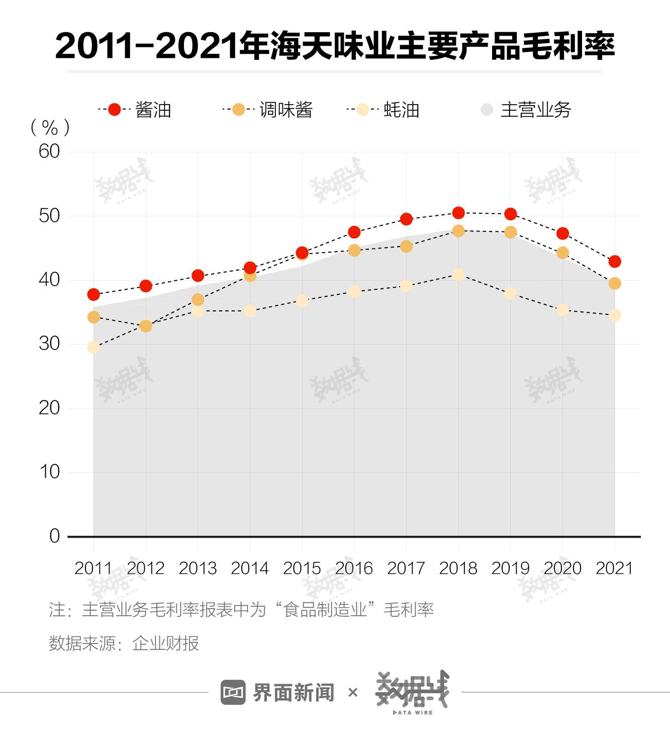 海天酱油不仅卖得最好,利润还高。截至2021年,近11年间,海天味业酱油产品毛利率始终高于主营业务整体毛利率。相比之下,调味酱和蚝油的毛利率基本都低于整体水平。