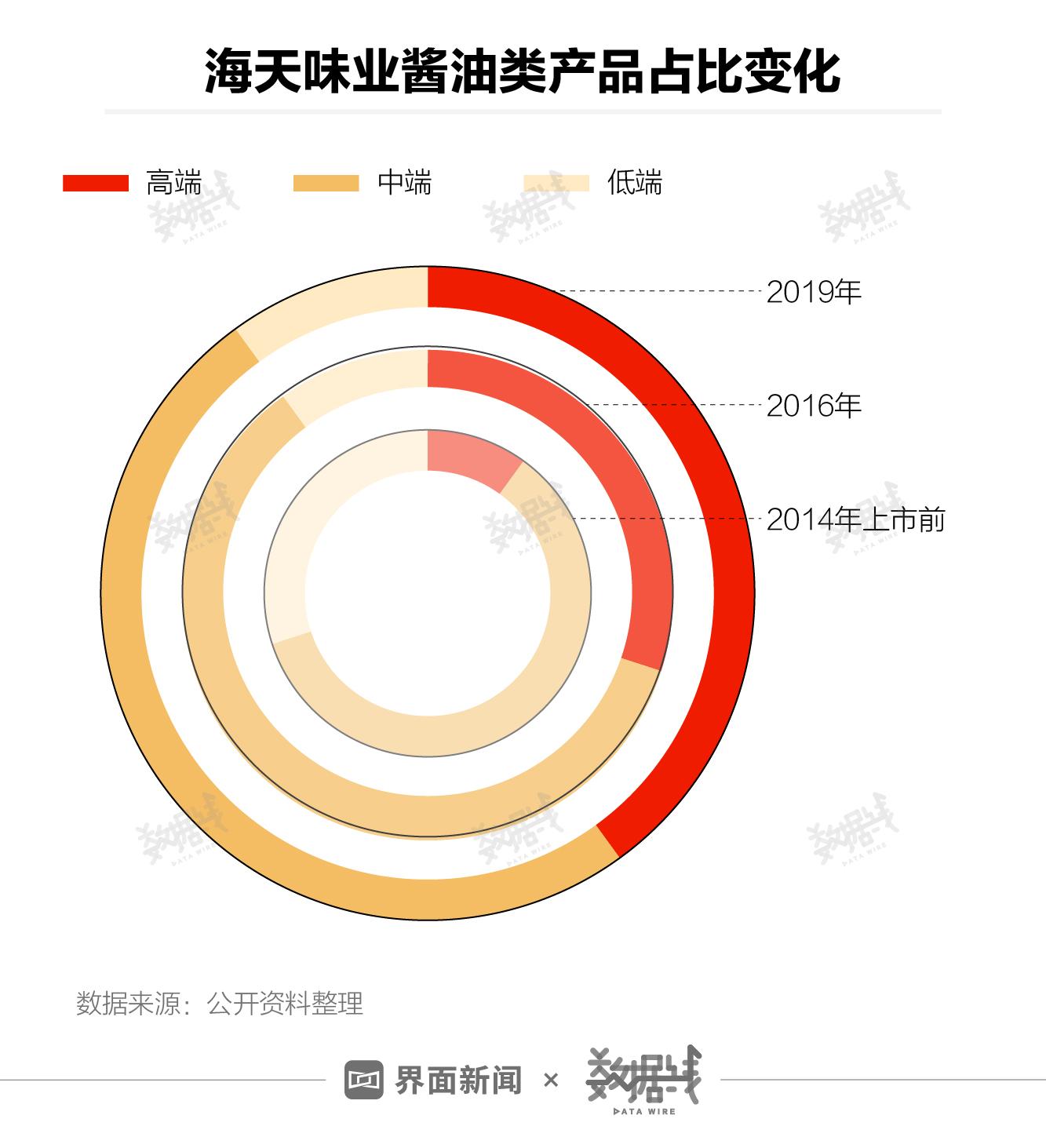 相比高端酱油,便宜酱油卖得更好。截至2019年末,海天味业酱油产品中,中低档酱油占比合计为6成,高档酱油占比为4成。