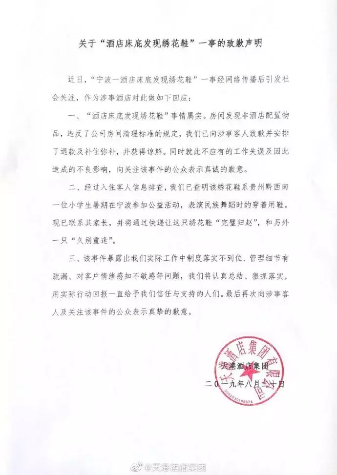 “酒店方在事发当时就已经与客人达成了谅解,后续客人入住酒店时产生了波折,才将前因讲了出来。”至于这只绣花鞋的主人也已经查明,系前几日,“一名贵州黔西南的小朋友到宁波参加公益夏令营入住酒店时遗落的,已经联系到家长,会将鞋子寄回给对方。