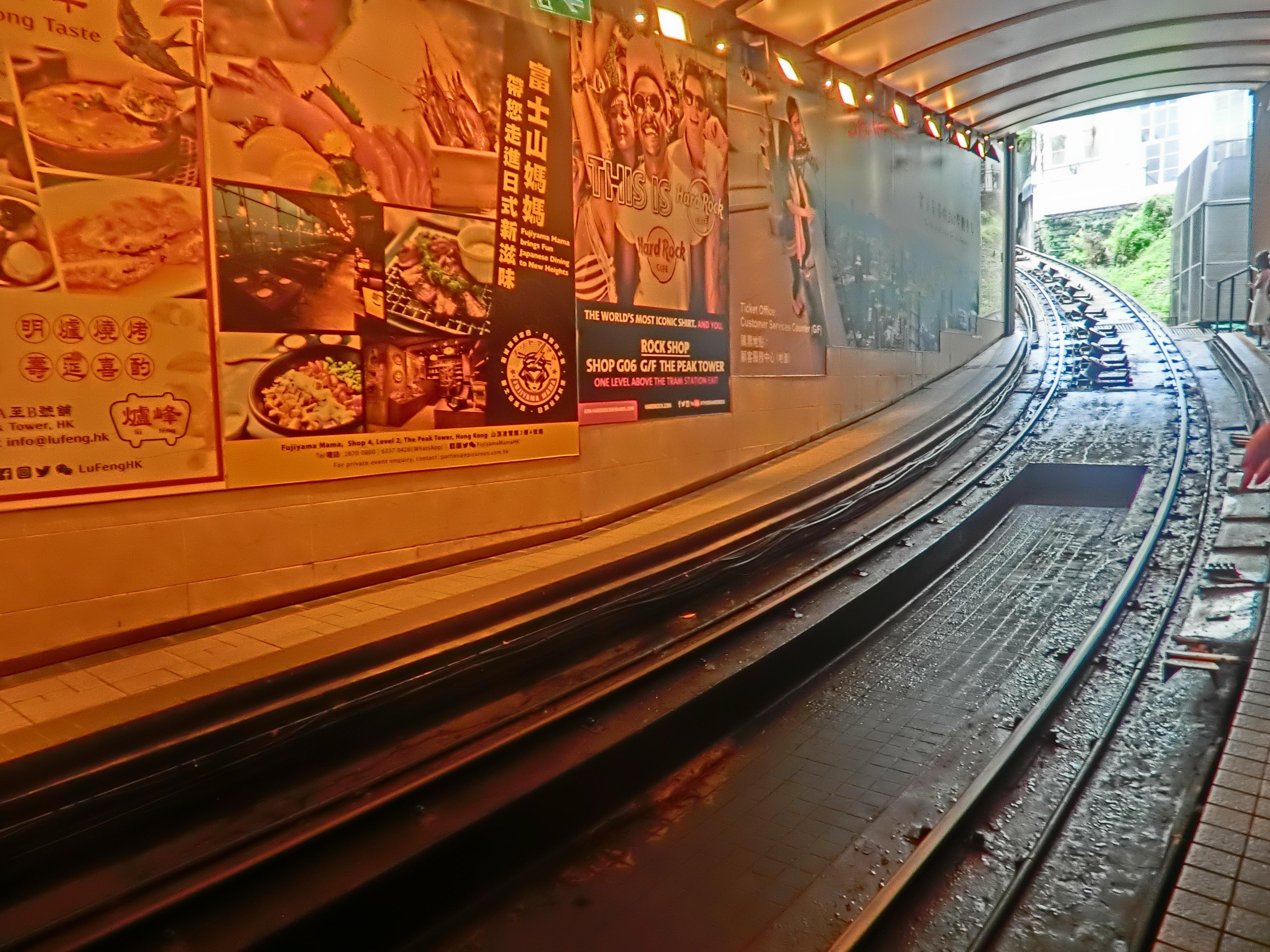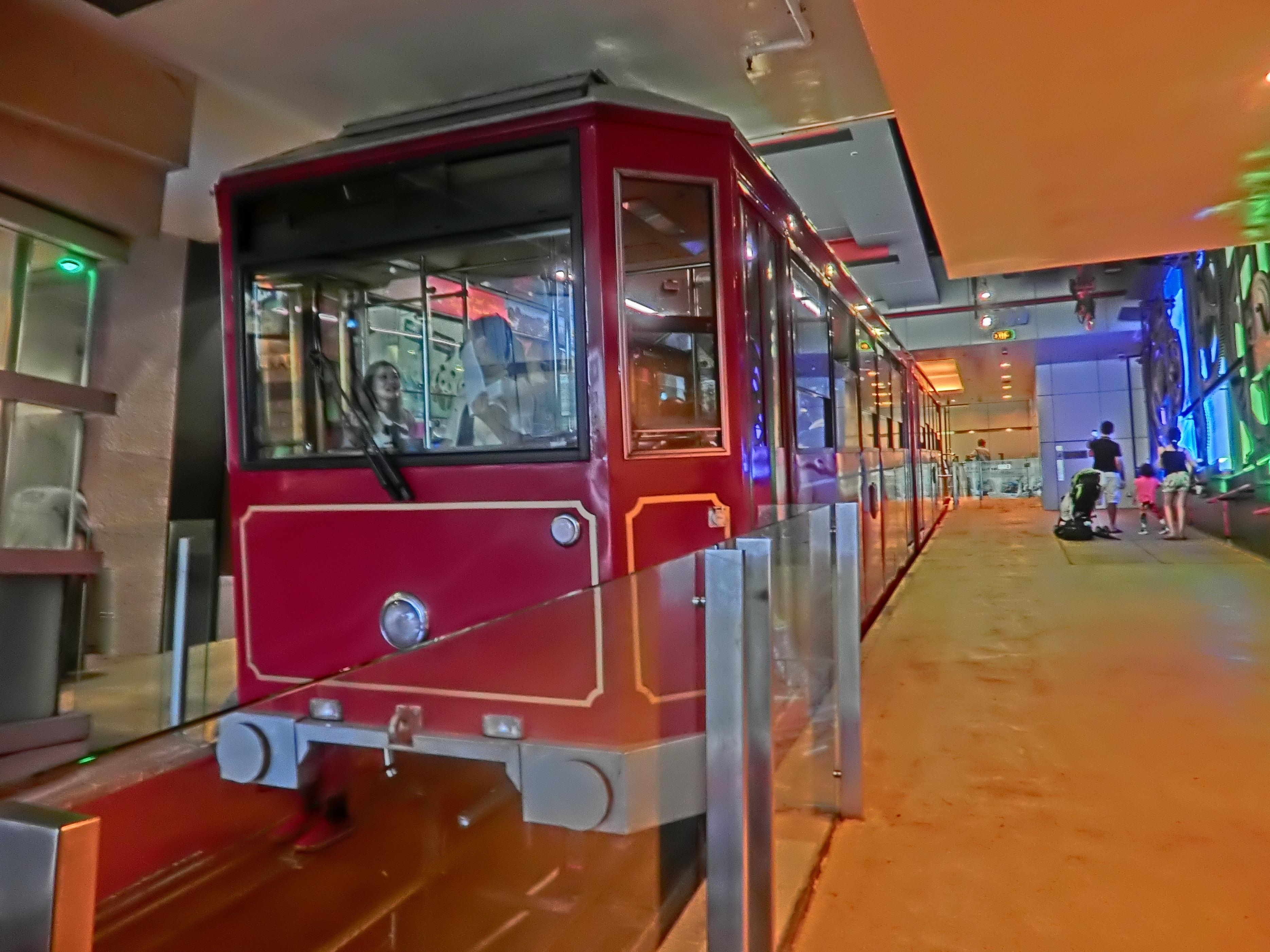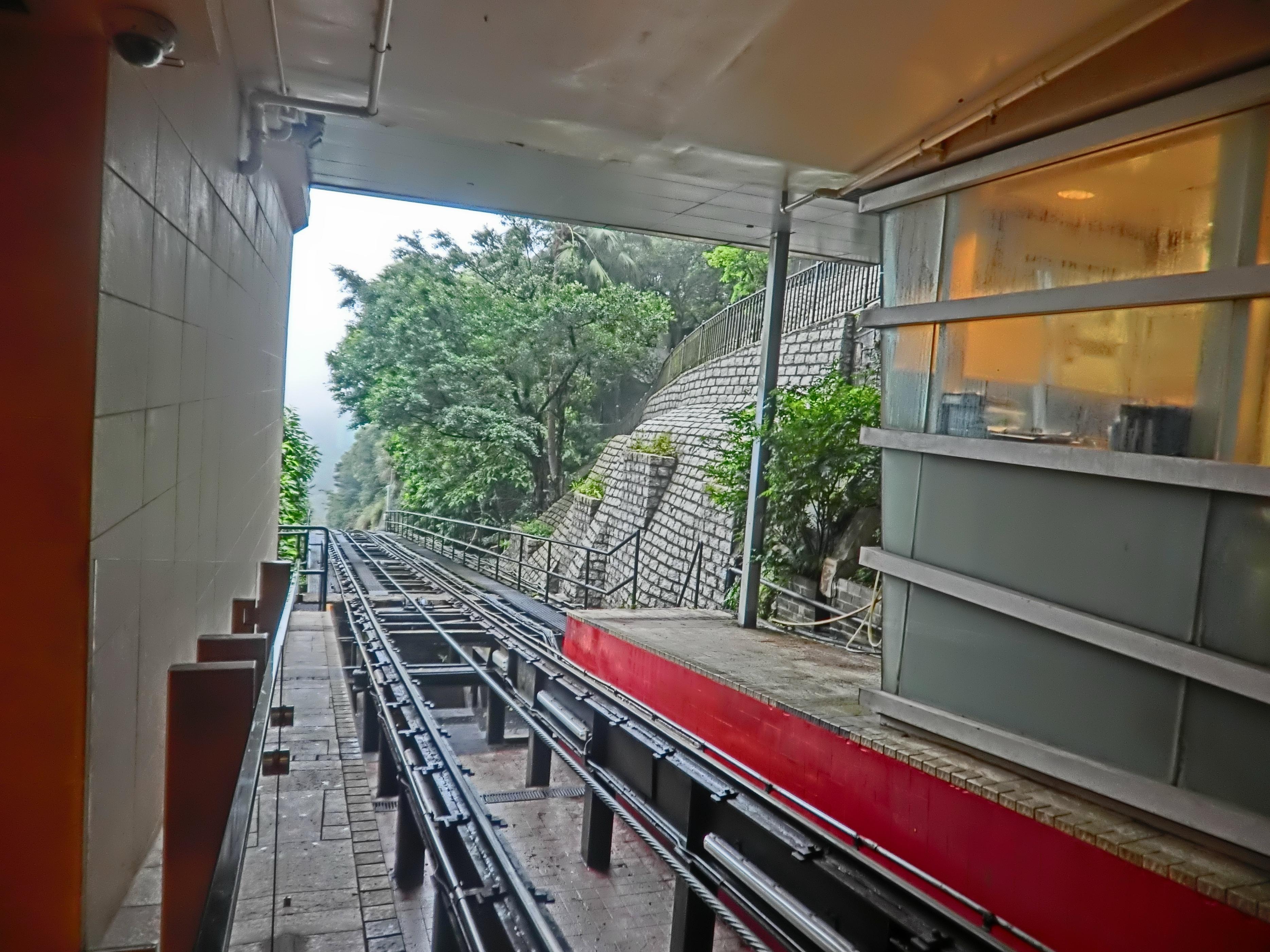 上太平山顶需要搭乘香港拥有百年历史之一的交通工具——缆车,往返山顶缆车51元,全程约十分钟,坐在车厢内,身子不由得向后倾,部分路段斜坡度介乎4至27度!沿途分布着一些山间别墅,树木间隔之间,还能看见山下中环的高楼大厦,颇有意思的缆车。
