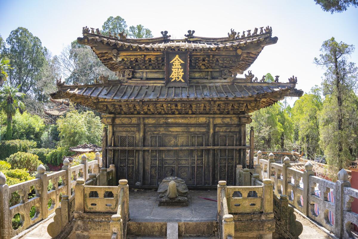 金殿,位于金顶之巅,是中国现存最大的铜铸镏金大殿,当年建造用了20吨精铜和300两黄金,金殿里面还有一盏600多年从未熄灭的长明灯。金殿里面供奉着真武大帝,朝拜者络绎不绝,进到里面祭拜要在紫宵宫预约。
