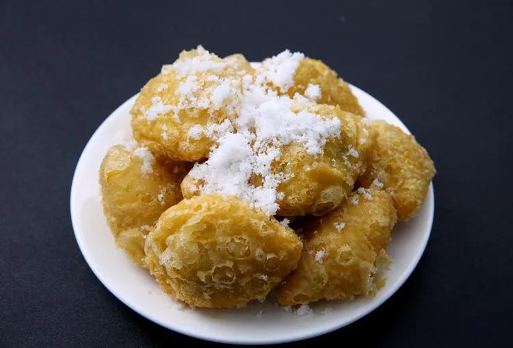 这是呼和浩特一道传承千年的传统糕点名吃。黄米炸糕是将黄米加工成粉状后蒸熟,趁热揉搓光滑,揉出弹性,包上豆沙馅,胡麻油烧到七成热后炸成金黄色捞出食用。一盘迷人的黄米炸糕,表面一定要有一层均匀的金黄油泡,金灿灿油润润,外表酥脆,内里软黏,豆馅甜香,欲罢不能。不包馅的炸素糕,酥软醇香,蘸食白糖亦别有风味。